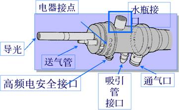 光(guāng)源接入部(圖8):光(guāng)源接入部是(shì)內(nèi)鏡與冷(lěng)光(guāng)↑源連接的(de)部分(fēn),其外(wài)部擁 ∏®✔有(yǒu)許多(duō)接口,包括導光(gu♣₽✔≥āng)束接頭,氣泵接口、水(shuǐ)瓶接口、吸引器ε>☆(qì)接口、通(tōng)氣口(漏水(shuǐ)測試器(qì)接口)β♦≥₽以及高(gāo)頻(pín)電(diàn)發生(shēng)器(qì)的₹☆β(de)安全接口等。